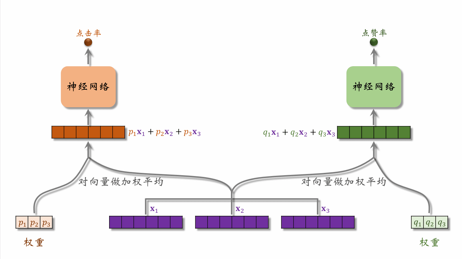 将用户特征,物品特征,统计特征和行为特征输入到左侧的神经网络中,再经过 softmax 激活函数得到一个权重向量,这种神经网络也叫做门控神经网络。向量中的三个值 分别代表着对 的权重值。右侧神经网络同理。