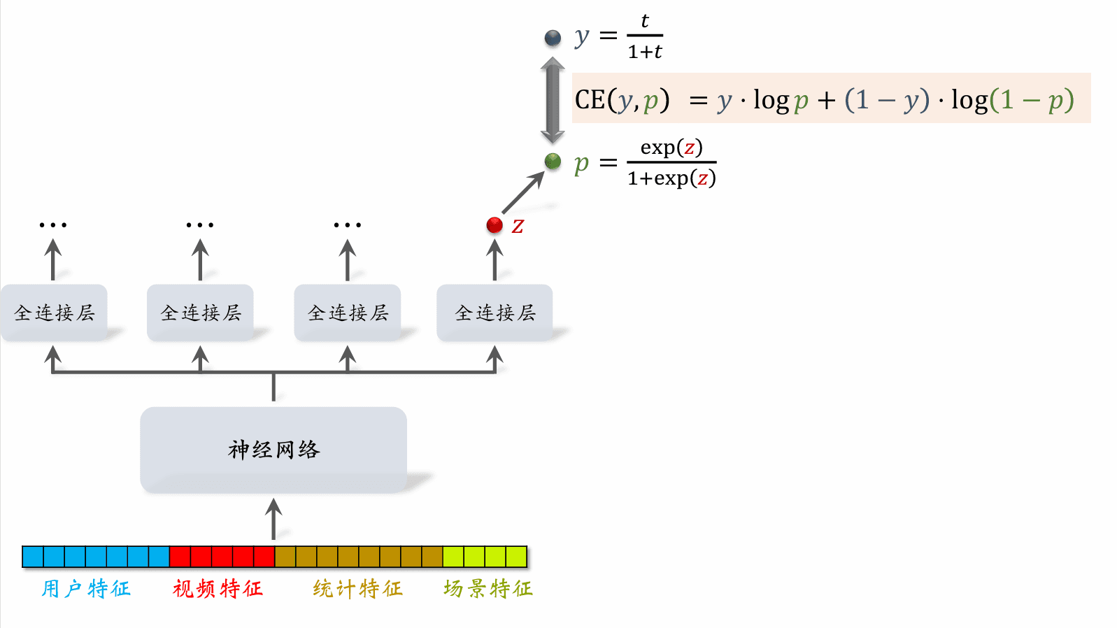 对于点击率来说,模型实际上就是根据点击率来判断一个物品是否为被点击物品。这是一个二元分类问题,因此用交叉熵损失函数。