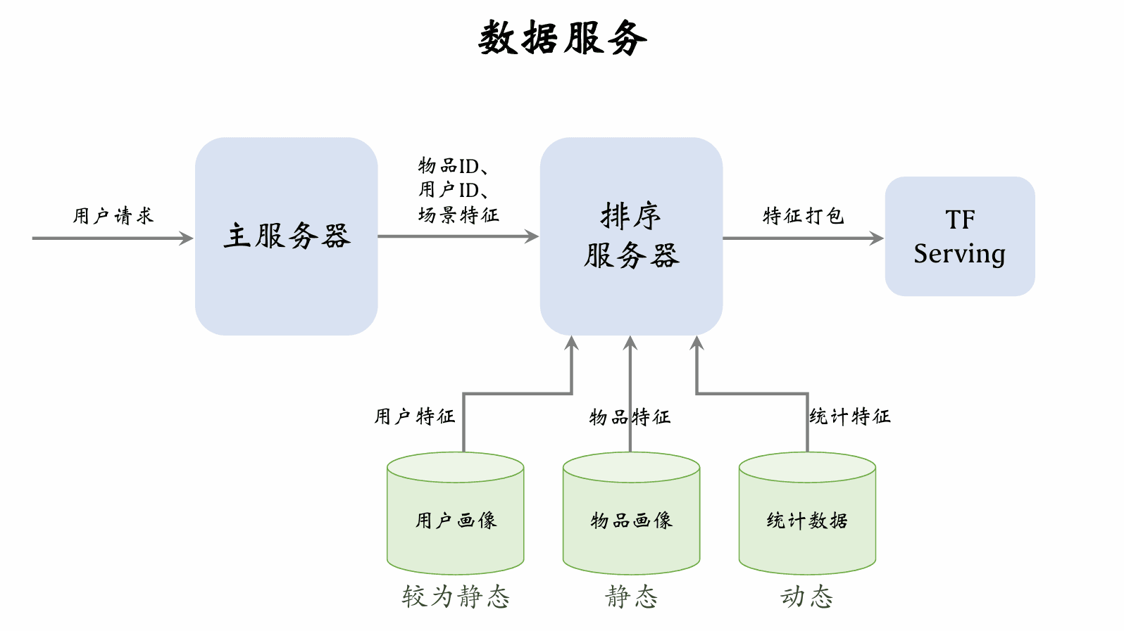 用户画像以及物品画像都比较静态,甚至可以将用户画像和物品画像直接缓存在排序服务器本地。统计数据是动态的,需要及时更新数据库。